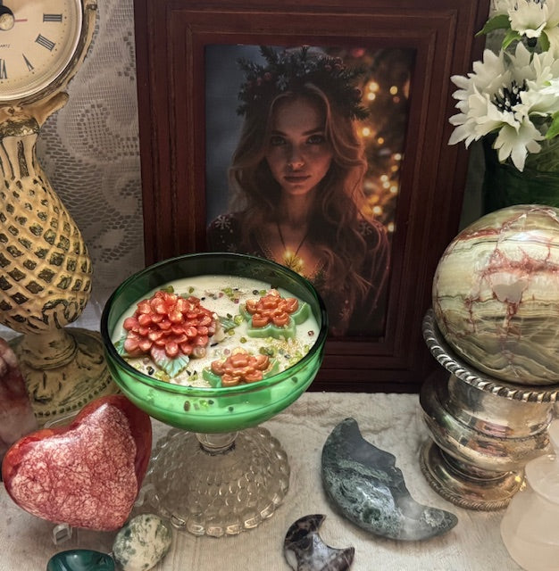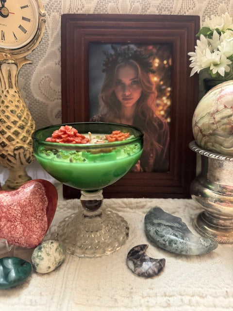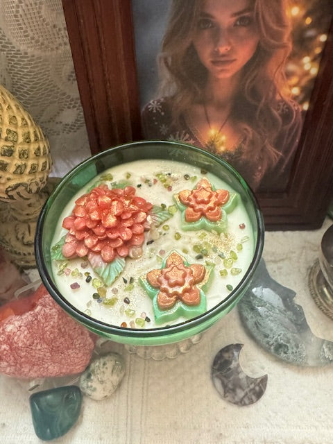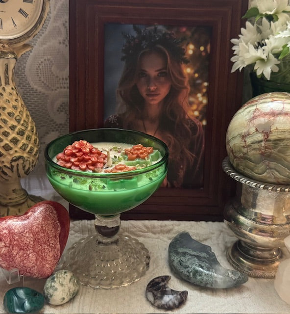 Vintage Anchor Hocking Emerald Green Boopie Bubble Sherbet Glass. ParaSoy/ Bees/ Coconut Wax Candle. Apple Cider Donut Scent. A Delectable Fall Fragrance of Crisp, Juicy Apples blended with a Rich, Aroma of Sweet Freshly Baked Doughnuts with hints of Cinnamon, Nutmeg, and Warm Vanilla. Candle adorned with Wax Mold Flowers, Olivine Quartz & Plum Blossom Tourmaline Crystals.