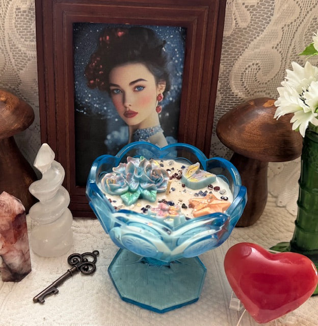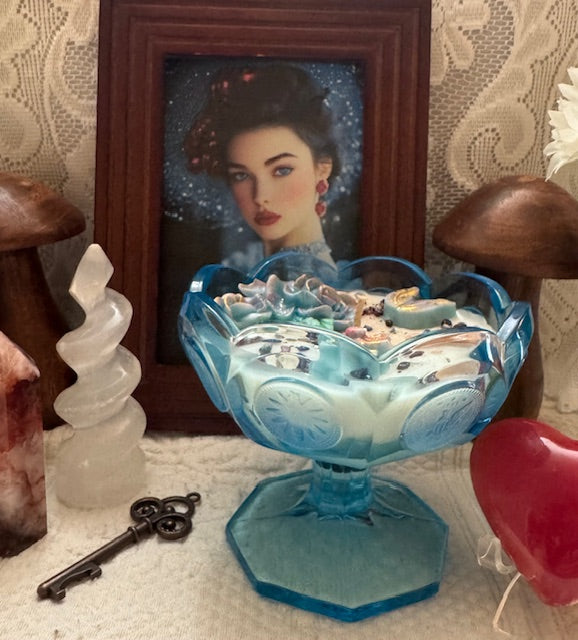 Vintage Fostoria Glass Coin Aqua Blue Compote Turquoise Pedestal Candy Dish. ParaSoy/ Bees/ Coconut Wax Candle. Apple Cider Donut Scent. A Delectable Fall Fragrance of Crisp, Juicy Apples blended with a Rich, Aroma of Sweet Freshly Baked Doughnuts with hints of Cinnamon, Nutmeg, and Warm Vanilla. Candle adorned with Star & Flower Wax Molds, Sodalite & Red Garnet Crystals.