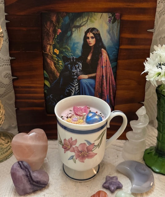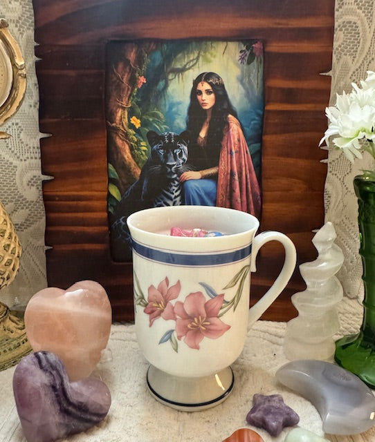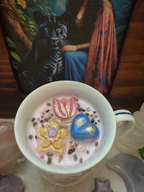 Vintage Princess House Deep Pink Peach Flowers, Blue Band Footed Tea Mug. ParaSoy/ Bees/ Coconut Wax Candle. Safari Scent- Cologne inspired, spicy warm wood, citrus, floral, herbal, leather with mossy notes. Adorned with Heart & Flower Wax Molds and Plum Blossom Tourmaline Crystals.
