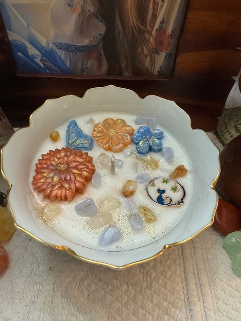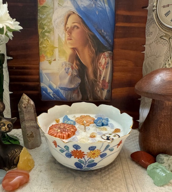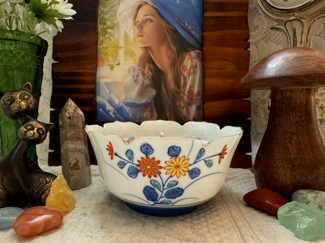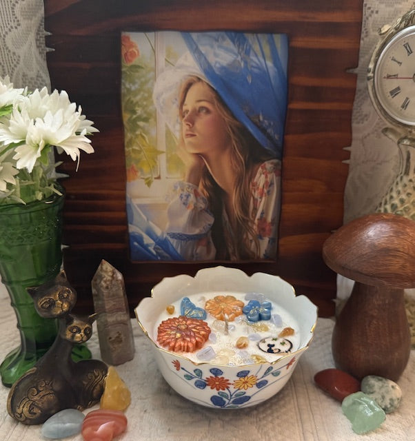 Vintage Japan Arata Porcelain Hand Painted Chrysanthemum Flowers Scalloped Rim Rice Bowl. ParaSoy/ Bees/ Coconut Wax Candle. Wild Huckleberry Honey Scent. A beautiful and complex fragrance of sweet, heavenly honey blended with the sweet and tangy aroma of wild huckleberries. Adorned with Flowers and Butterfly Wax Molds, Stars & Cat Charm, Blue Lace Agates and Citrine Crystals.