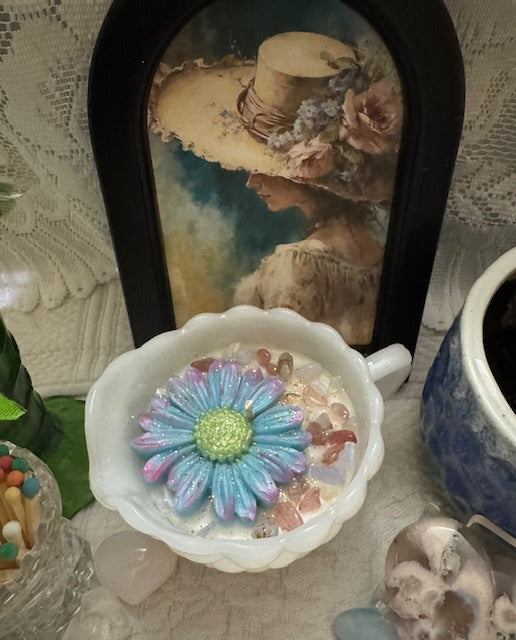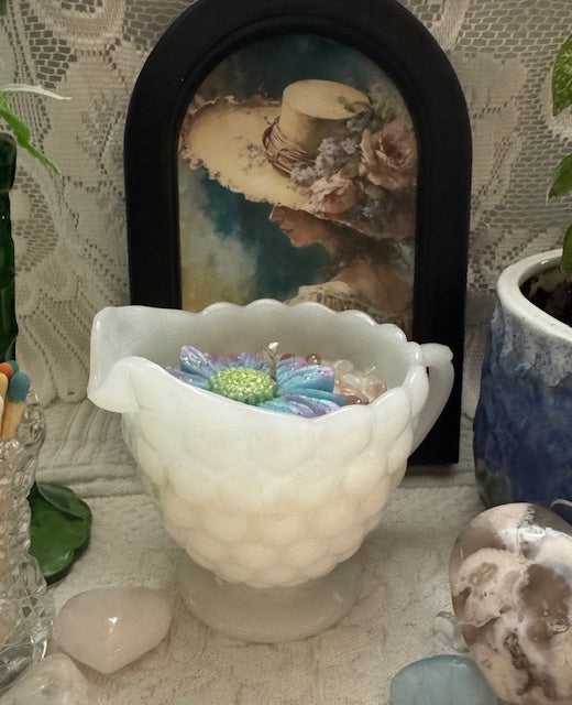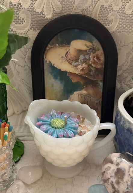Vintage Anchor Hocking, Bubble Pattern Milk Glass Creamer. ParaSoy/Bees/Coconut wax candle. Cherry Almond Scent. A perfect blend of ripe cherries and toasted almonds. Adorned with Blue Lace Agate, Strawberry Quartz, Large Daisy mold.