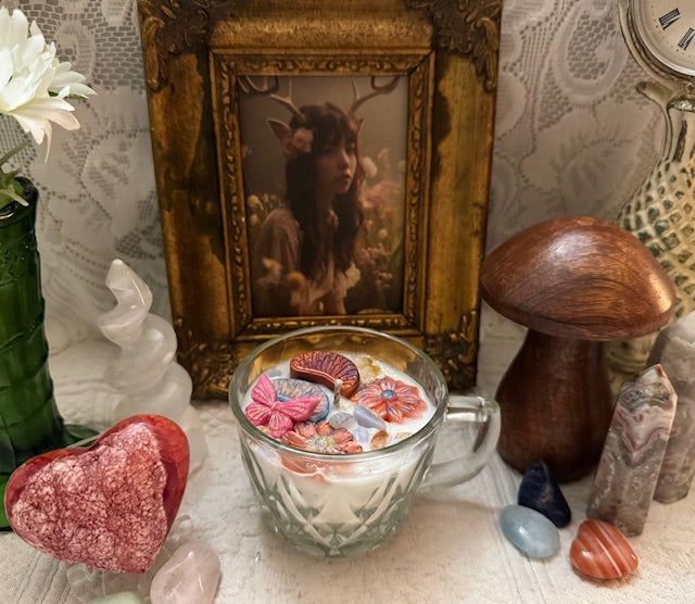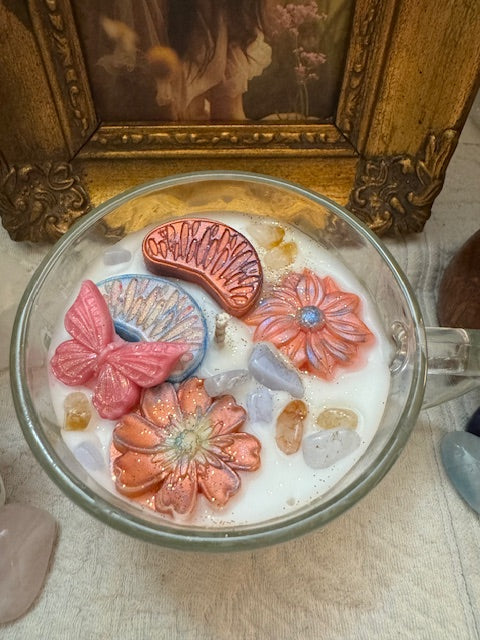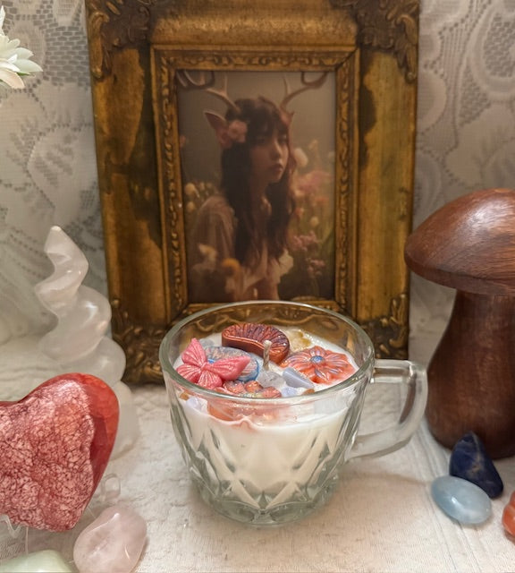 Vintage Anchor Hocking, Crown Point Pattern Punch Cup. ParaSoy/ Bees/ Coconut Wax Candle. Wild Huckleberry Honey Scent. A beautiful and complex fragrance of sweet, heavenly honey blended with the sweet and tangy aroma of wild huckleberries. Adorned with Flower, Butterfly & Fruit Wax Molds, Blue Lace Agate and Citrine Crystals.