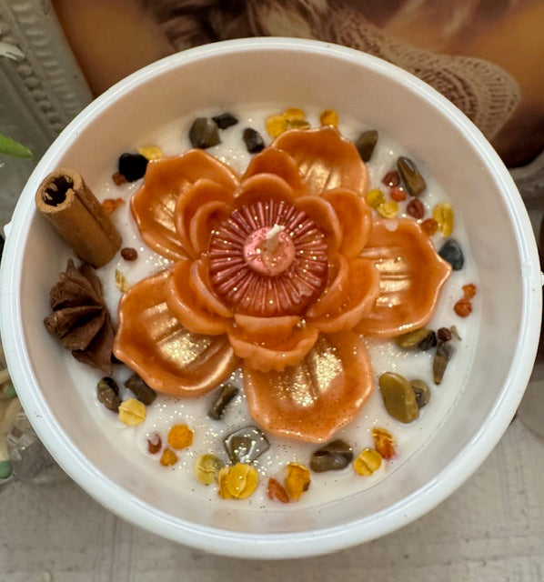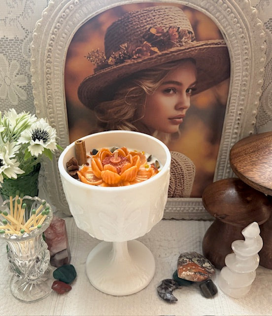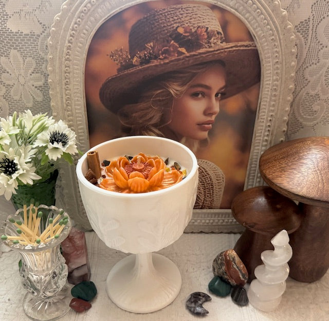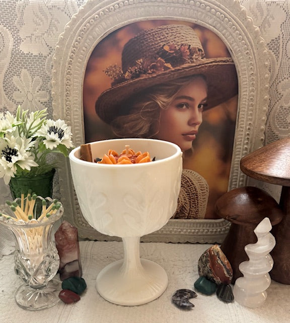 Vintage FTD 1975 White Milk Glass Oak Leaf Footed Compote Bowl/ Goblet. ParaSoy/ Bees/ Coconut wax Candle. Gingerbread Scent. Is a blend of vanilla, nutmeg, and cinnamon; for a delicious fragrance. Candle adorned with Large Flower Wax Mold, Cinnamon Stick, Star Anise, Dried Albizia Flowers & Tiger's Eye Crystals.