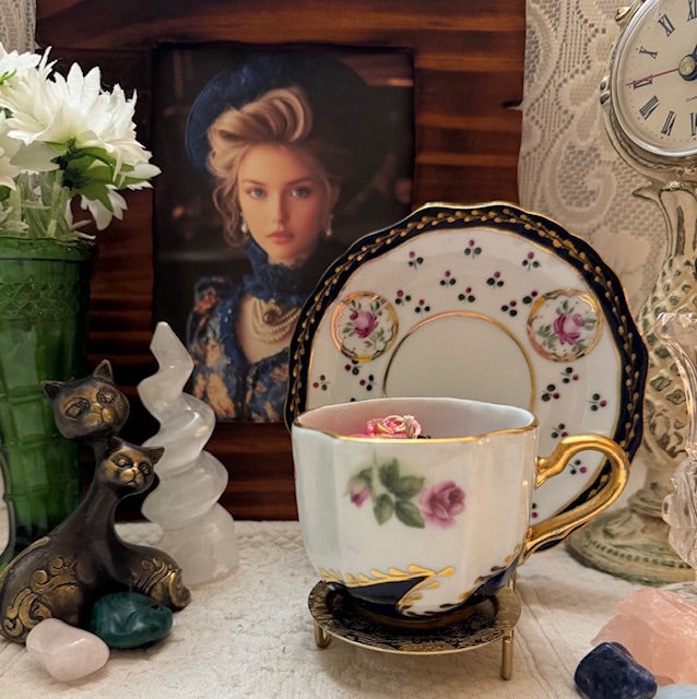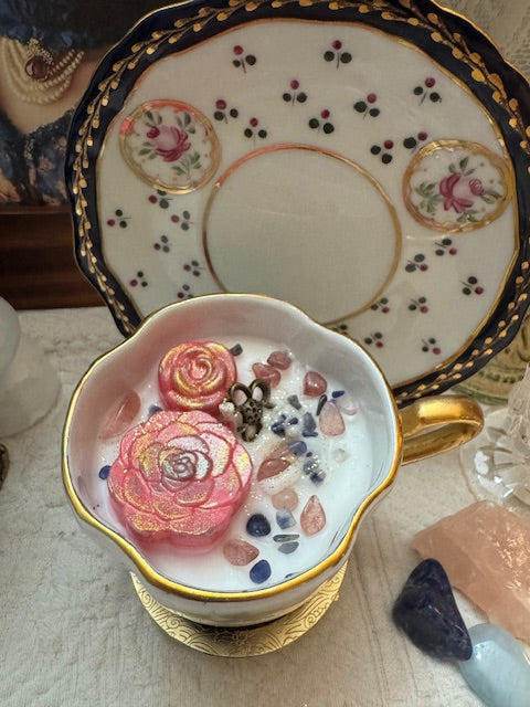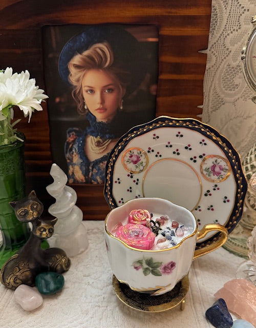 Vintage Limoges Porcelain Early to Mid-20th Century, Pink Rose Bud Flower Cobalt Blue Stripe Teacup & Saucer. ParaSoy/ Bees/ Coconut Wax Candle. Wild Huckleberry Honey Scent. A beautiful and complex fragrance of sweet, heavenly honey blended with the sweet and tangy aroma of wild huckleberries. Adorned with Flower Wax Molds, Flower Charm, Strawberry Quartz and Sodalite Crystals.