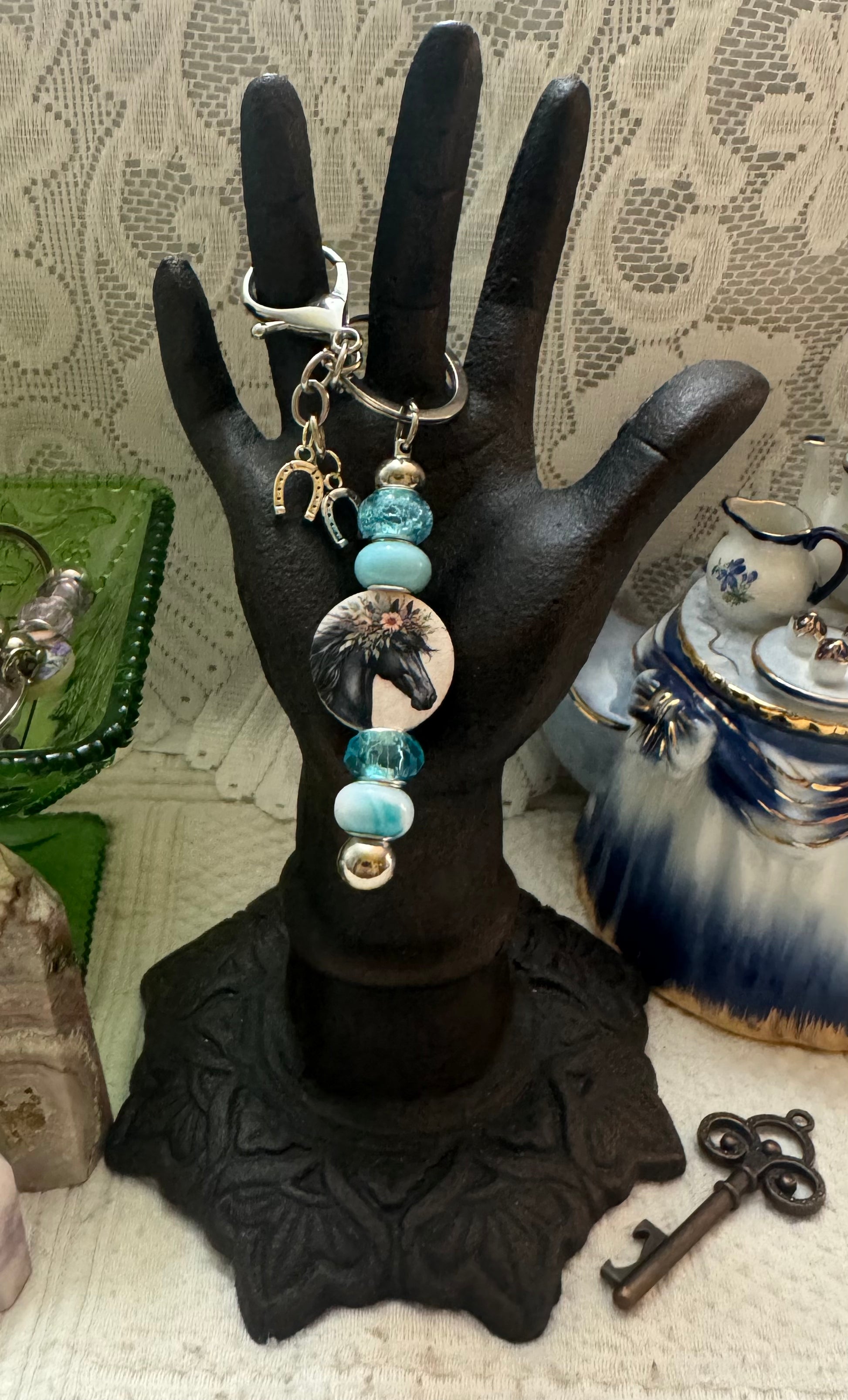 Large Handcrafted, Decoupaged Horse Bead with Accenting European Style Beads & Horseshoe Charms.