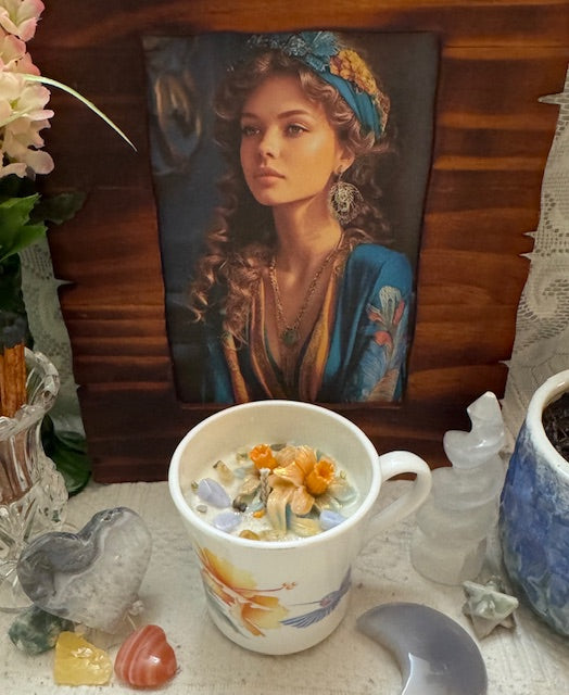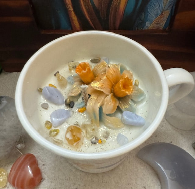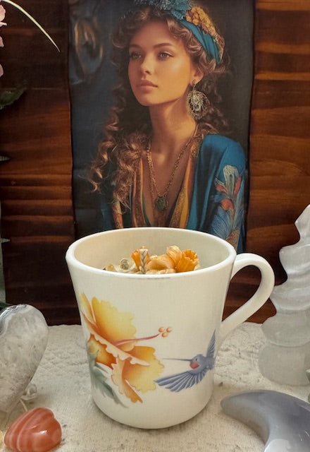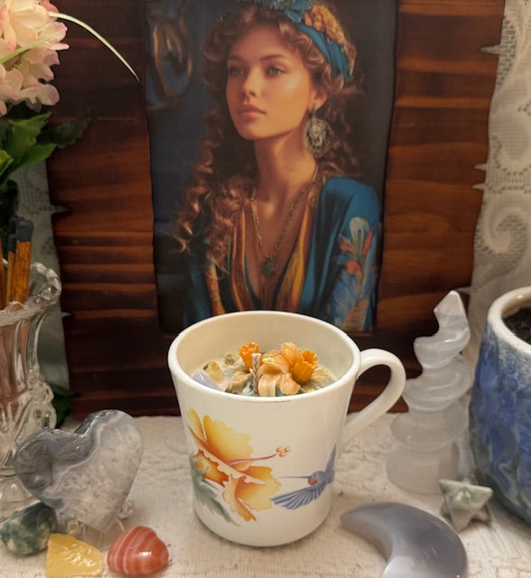 Vintage1980's Corelle-Corning, Vitrelle glass Hummingbird design Coffee Mug. ParaSoy/ Bees/ Coconut Wax Candle. Honeysuckle Scent. Sweet and rich honeysuckle with light florals, a perfect scent for spring-time. Adorned with Flower Wax Mold, Citrine, Blue Lace Agate & Bumblebee Jasper Crystals.