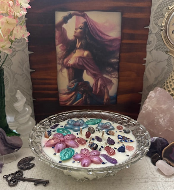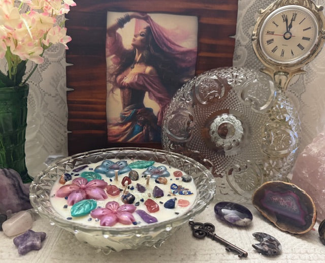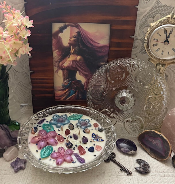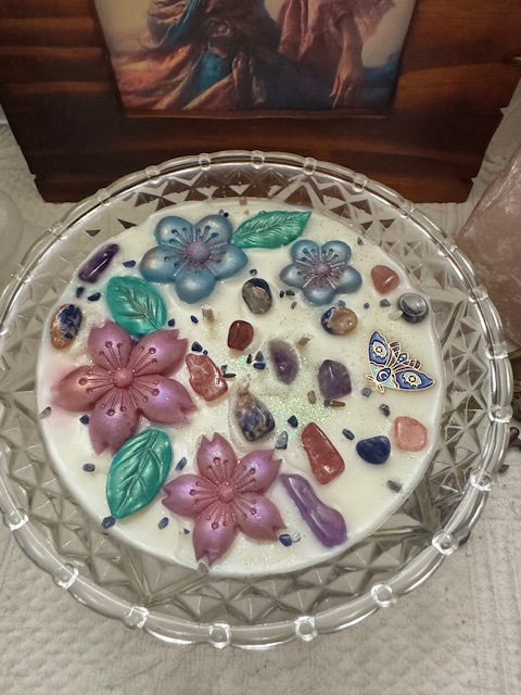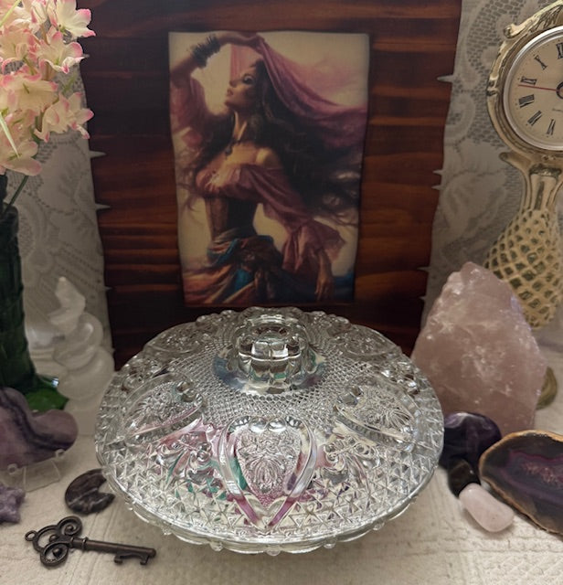 Vintage KIG Malaysia Clear Glass Candy Dish w/Lid Fleur De Lis Hearts. ParaSoy/ Bees/ Coconut Wax Triple Wick Candle. Black Raspberry Vanilla Scent. This scent has the aroma delicious black raspberries with your favorite vanilla ice cream. Candle adorned with Wax Flower Molds, Moon Moth Charms, Strawberry Quartz, Sodalite & Amethyst Crystals.