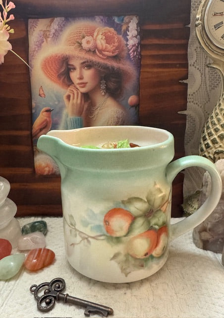 Vintage Hand Painted Fruit Pitcher. Signature of H. Holcomb Made in China. ParaSoy/ Bees/ Coconut Wax Candle. Peach Magnolia Raspberry Scent. Combination of Fruity Peaches & Raspberry with a top note of Magnolia Flowers. Candle adorned with Large Daisy Wax Mold Flower, Citrine and Carnelian Crystals.