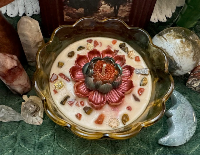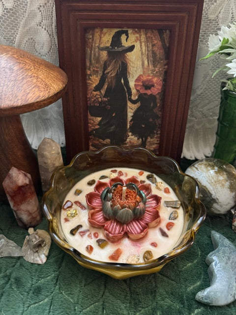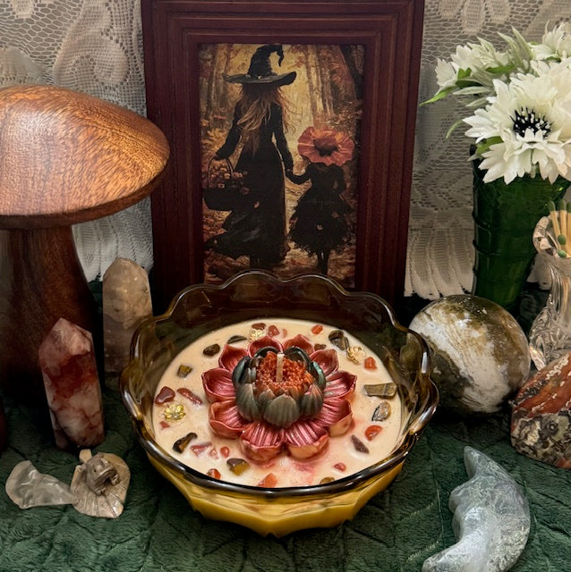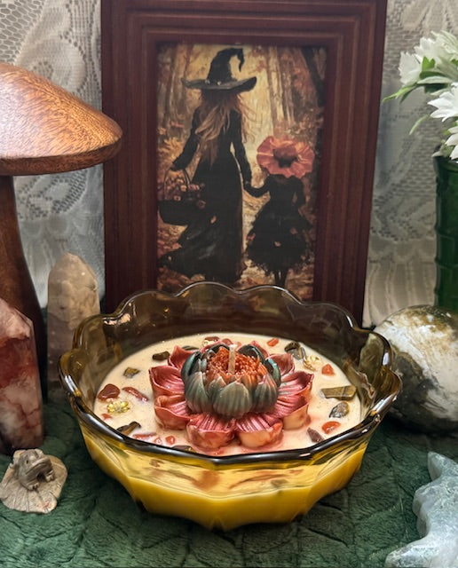 Vintage Anchor Hocking Fairfield Pattern Amber Glass Bowl. ParaSoy/ Bees/ Coconut Wax Candle. Marshmallow Pumpkin Pie Scent. This fragrance is a blend of creamy vanilla and toasted marshmallows with a touch of pumpkin & Spice . Candle is adorned with Large Lotus Flower Wax Mold, Flower Charms, Carnelian & Tiger's Eye Crystals.