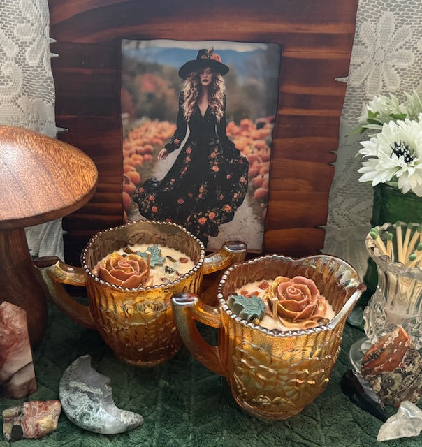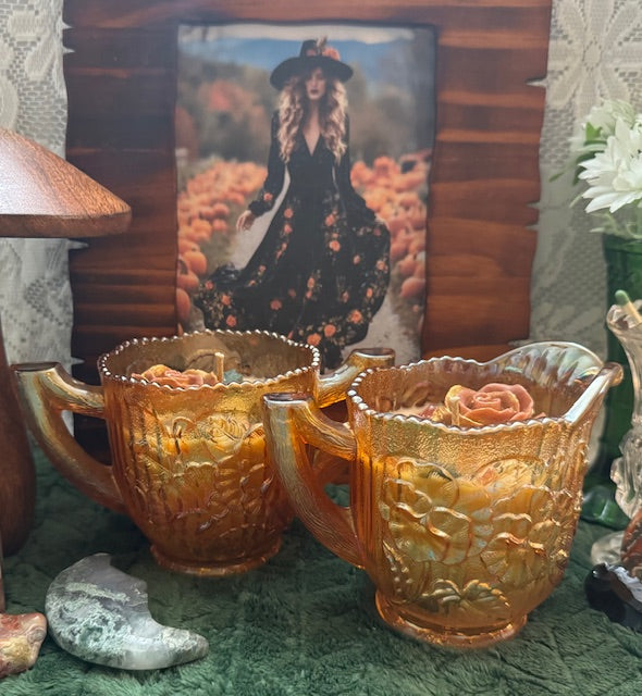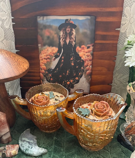 Vintage Imperial Carnival Amber Creamer & Sugar Bowl Set in a Beautiful Marigold "Pansy" Pattern. ParaSoy/ Bees/ Coconut Wax Candle. Marshmallow Pumpkin Pie Scent. This fragrance is a blend of creamy vanilla and toasted marshmallows with a touch of pumpkin & Spice . Candle is adorned with Leaf & Flower Wax Molds, Carnelian & Tiger's Eye Crystals.