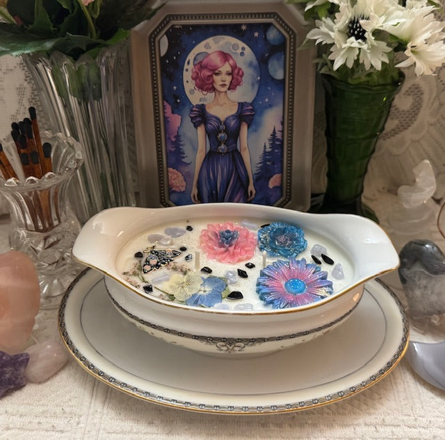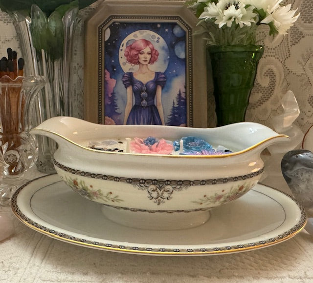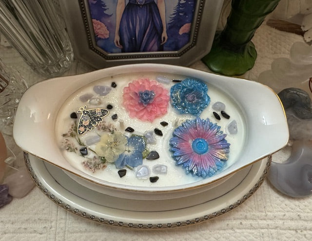 Vintage Noritake Japan Castella Pattern 80463 Gravy Boat with Attached Under Plate. ParaSoy/ Bees/ Coconut Double Wick Wax Candle. Sweet Pipe Tobacco Scent. The nostalgic scent of pipe tobacco with a touch of sweet honey. Adorned with Pressed Flowers, Moon Moth Charm, Obsidian and Blue Lace Agate Crystals.