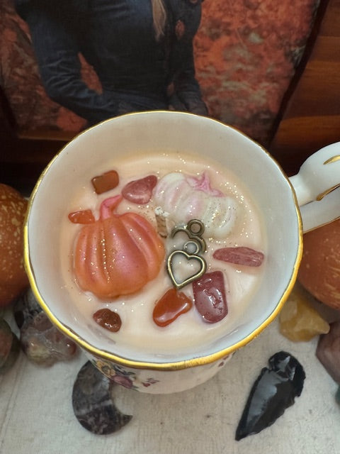 Vintage Royal Windsor Fine Bone China Floral Boutique Cup (Gold Trim) England. ParaSoy/ Bees/ Coconut Wax Candle. Vanilla Pumpkin Marshmallow Scent. This fragrance is a blend of creamy vanilla and toasted marshmallows with a touch of pumpkin . Candle is adorned with Pumpkin Wax Molds, Heart Charms, Carnelian & Strawberry Quartz Crystals.