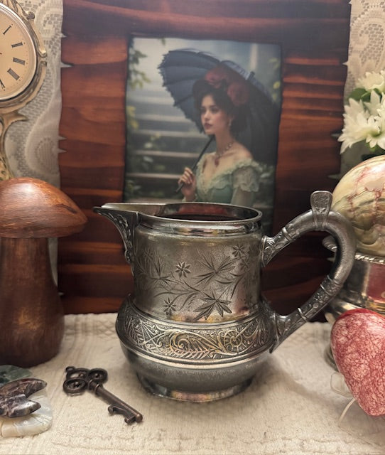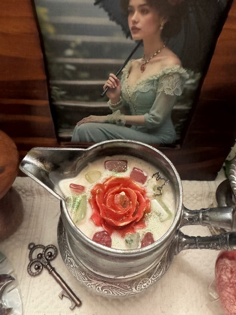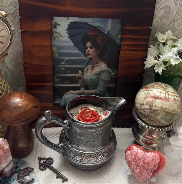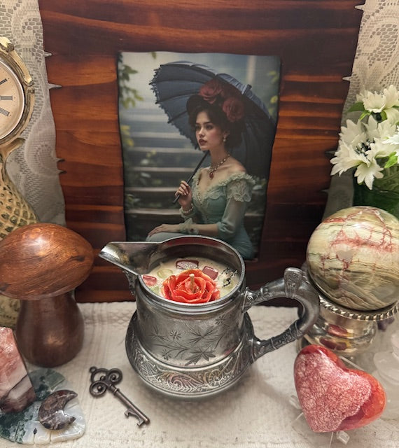 Antique Pairpoint MFg Co. Quadruple Plate Silver-Plated Floral Creamer. ParaSoy/ Bees/ Coconut Wax Candle. Apple Cider Donut Scent. A Delectable Fall Fragrance of Crisp, Juicy Apples blended with a Rich, Aroma of Sweet Freshly Baked Doughnuts with hints of Cinnamon, Nutmeg, and Warm Vanilla. Candle adorned with Rose Wax Mold, Leaf Charm, Strawberry Quartz & Prehnite Crystals.
