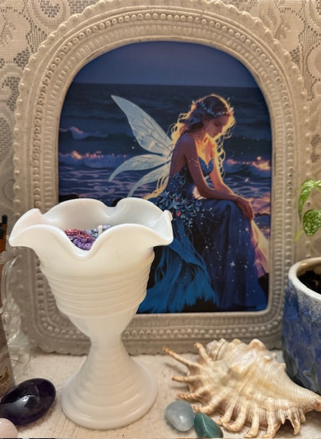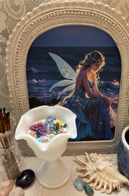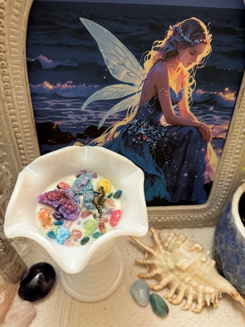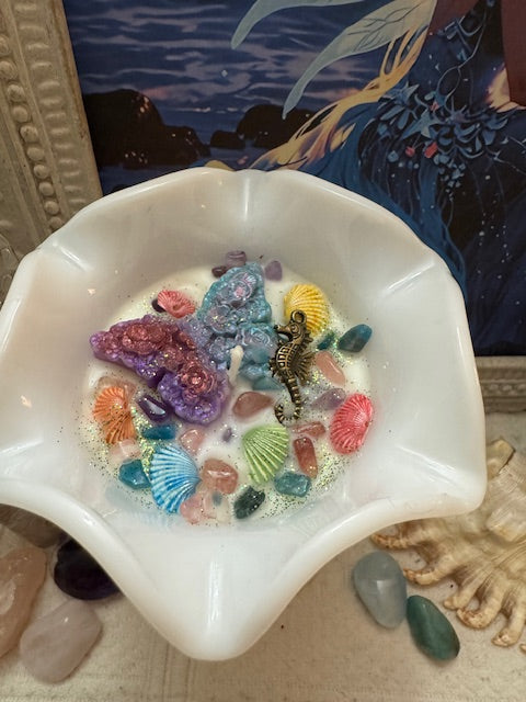 Vintage Mid-Century Modern Milk Glass Tulip Shape Ice Cream Cup, Ribbed Pattern Scalloped Top. ParaSoy/ Bees/ Coconut Wax Candle. Sex on the Beach Scent. The sweet and fruity tropical drink blends pineapple and orange with touches of spice, vanilla, and florals. Adorned with Butterfly Wax Mold, Seahorse Charm, Sea Shells, Amethyst, Strawberry Quartz and Apatite Crystals.