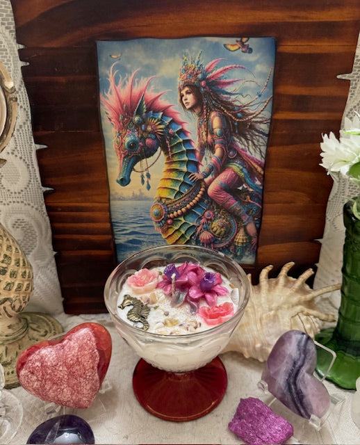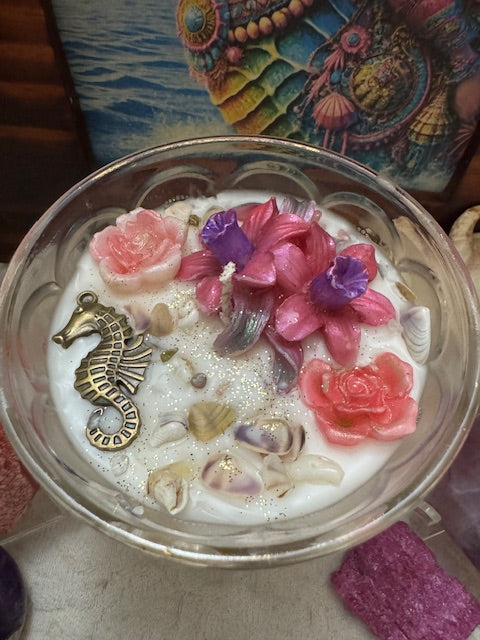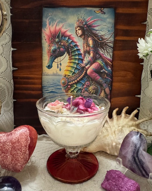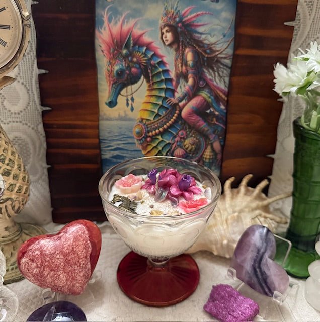 Vintage Manhattan Pattern by US GLASS, with Red Flashed Base. and Clear Basket & Cane Pattern Sherbet Cup. ParaSoy/ Bees/ Coconut wax candle. Pina Colada Scent. If you like getting caught in the rain- this fragrance is perfect for you! A refreshing blend of sweet pineapple juice, creamy coconut, and rum that reminds you of vacation. Adorned with Flower Wax Molds, Seahorse Charm & Seashells.