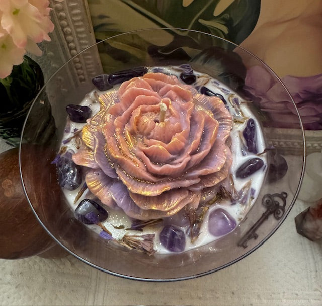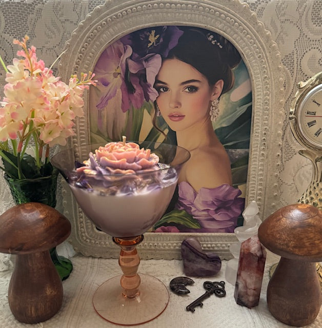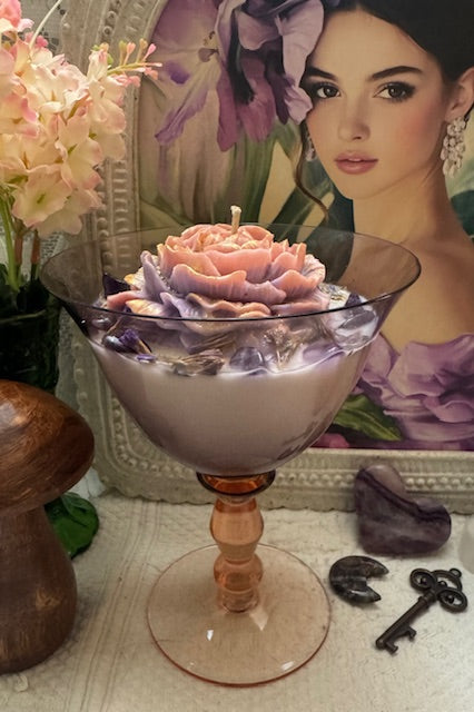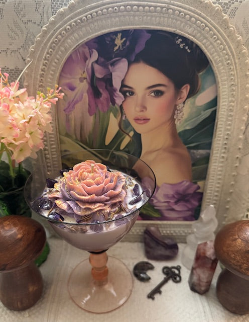 Mikasa Estate Amethyst & Pink Crystal Martini Wine Goblet. The Goblet are more than just Drinkware, they are a statement piece that embodies Sophistication and Luxury. ParaSoy/ Bees/ Coconut Wax Candle. Hibiscus Tea Sent. A Perfect combination of Citrus, apple, raspberry crystals Top notes. Middle notes of Herbal, Lily of the Valley. Velvet Woods and Light Musky undertone. Candle Adorned with Large Flower Wax Mold, Amethyst Crystals and Dried Forget Me Not Flowers.