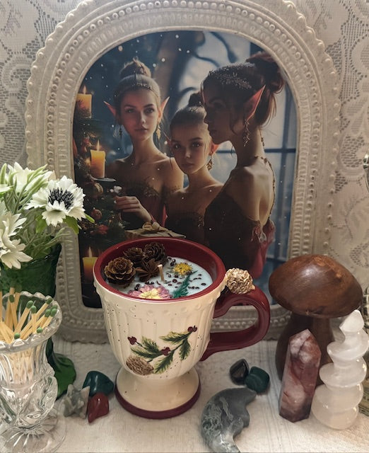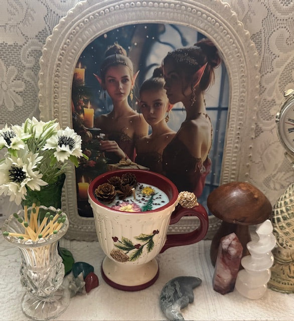 Vintage Holiday Beige & Burgundy Winter Sprig Footed Mug with Acorn on the handle. ParaSoy/ Bees/ Coconut Wax Candle in Christmas Tree Scent. The Smell of a Freshly cut 8 Foot Pine comes to life with notes of Pine Needles & Earthy Patchouli. Candle is adorned with Pressed Flowers, Pine Cones, Star Anise & Red Garnet Crystals.